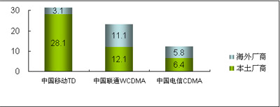 在3G設(shè)備市場(chǎng)方面,2008年,中國的WCDMA、CDMA2000與TD-SCDMA三種3G網(wǎng)絡(luò)在建設(shè)上有不同的進(jìn)展。中國移動(dòng)啟動(dòng)了第二階段的TD-SCDMA網(wǎng)絡(luò)建設(shè)、中國電信啟動(dòng)了涉及面向81個(gè)重點(diǎn)城市的CDMA全網(wǎng)招標(biāo)、而中國聯(lián)通也開始7個(gè)城市建立WCDMA試驗(yàn)網(wǎng)絡(luò)的建設(shè)工作。而在所有的網(wǎng)絡(luò)建設(shè)中,中國本土廠商借3G契機(jī)迅速提升競(jìng)爭(zhēng)力,占據(jù)了3G網(wǎng)絡(luò)建設(shè)大部分市場(chǎng)份額。