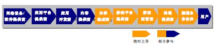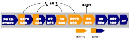 和記電訊是香港最大的流動網(wǎng)絡(luò)運營商。2004年1月,和記電訊率先在香港推出世界級的3G服務(wù)。其目標(biāo)就是成為最佳的3G移動通信多媒體通信運營商。和記電訊在產(chǎn)業(yè)鏈上承擔(dān)的角色如圖3所示。