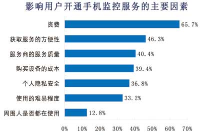 諾達(dá)咨詢進(jìn)一步對(duì)用戶開(kāi)通手機(jī)監(jiān)控服務(wù)的主要考慮因素進(jìn)行調(diào)查,結(jié)果表明,最重要的因素為資費(fèi),有66%的用戶認(rèn)為資費(fèi)是重要的考慮因素。其次,46%的用戶認(rèn)為獲取服務(wù)的方便性(即業(yè)務(wù)辦理流程)是影響用戶開(kāi)通手機(jī)監(jiān)控業(yè)務(wù)的重要因素。其他,包括服務(wù)商的質(zhì)量保障、設(shè)備成本、隱私安全和使用難易度對(duì)用戶也有一定的影響,但是影響較小。