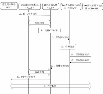 - 會話控制實(shí)體收到IPTV業(yè)務(wù)請求后,根據(jù)用戶所在的地理位置、用戶類型等信息選擇為該用戶服務(wù)的CDN-CF,并向CDN-CF發(fā)送媒體資源請求。