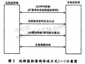 (1)遠(yuǎn)程監(jiān)控端呼叫本地監(jiān)控端,將遠(yuǎn)程監(jiān)控密碼暗文作為H.225消息中的擴(kuò)展項(xiàng)傳送至本地監(jiān)控端;