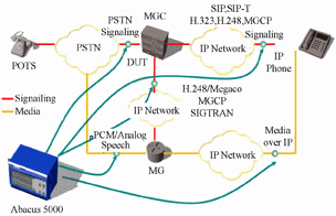 當(dāng)軟交換作為NGN網(wǎng)絡(luò)中的本地端局使用時(shí),一般用于控制終端用戶的話務(wù)接續(xù),并提供各種補(bǔ)充業(yè)務(wù)。因此,測(cè)試端局功能時(shí),需要儀表通過(guò)模擬接入網(wǎng)關(guān)下的用戶或者IP終端用戶,實(shí)現(xiàn)本地話務(wù)的仿真。圖5所示,在實(shí)際測(cè)試時(shí),可以根據(jù)情況,配置基于SIP,H.323,Megaco或者M(jìn)GCP各種協(xié)議的終端設(shè)備,實(shí)現(xiàn)同種協(xié)議終端之間或者不同協(xié)議之間大話務(wù)量的呼叫測(cè)試。