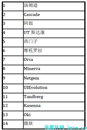 在中國市場上,UT 斯達(dá)康和中興公司暫時(shí)領(lǐng)先于其他公司。其中,UT 斯達(dá)康在海外也有不俗的表現(xiàn),如在印度和日本市場等;華為公司可以借助其整體解決方案的實(shí)力,有機(jī)會(huì)在下一代基于IMS 的IPTV 解決方案中脫穎而出。MRG 曾經(jīng)在2007 年3 月公布過一個(gè)市場調(diào)查,對IPTV 中間件及其市場影響力進(jìn)行了一個(gè)排名,具體的結(jié)果見表1。