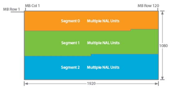 在這種架構(gòu)中,編碼器的實施分配到多個 DSP 內(nèi)核。每個宏塊條都分配到一個DSP內(nèi)核。其中每個內(nèi)核都提供一些特定功能,如:速率控制與幀內(nèi)圖像處理。事實上,無法預(yù)先進行比特預(yù)算并分配到各個宏塊條,因為不同宏塊條可能具有不同的圖像復(fù)雜性,而在圖像分割塊之間采用差異很大的Qp值會造成合成圖像的層邊界出現(xiàn)偽影。在H.264中,宏塊條NAL可以包含任意數(shù)量的宏塊,因此與H.263不同,圖像分割塊的形狀無需符合GOB邊界。每個宏塊條的頭部(slice