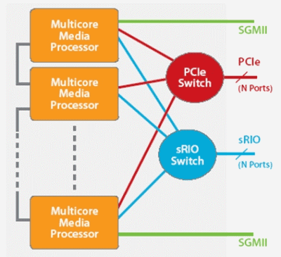 圖3說明,高速串行I/O在復(fù)雜視頻處理任務(wù)中的潛在應(yīng)用。圖中顯示用于擴展多個器件中多核器件處理能力的連接方案,其可以實現(xiàn)更復(fù)雜的視頻處理運算或支持更多視頻轉(zhuǎn)碼通道。采用sRIO開關(guān)能夠?qū)崿F(xiàn)更靈活的器件間通信,不過如果處理流處于相鄰器件之間,也可以不采用這種開關(guān)。與PCIe開關(guān)相比,sRIO由于其數(shù)據(jù)包開銷較低,因此一般成本更低、性能更高、且時延更短。