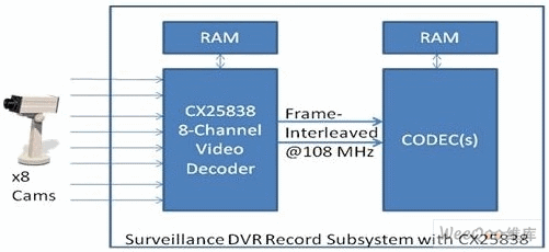 為了應(yīng)對這個(gè)挑戰(zhàn)并降低集成成本,科勝迅系統(tǒng)公司新近推出8通道視頻解碼器CX25838和CX25858,可提供幀交錯輸出并與監(jiān)控DVR中普遍使用的編解碼器兼容。圖2顯示了當(dāng)帶有幀交錯輸出的CX25838