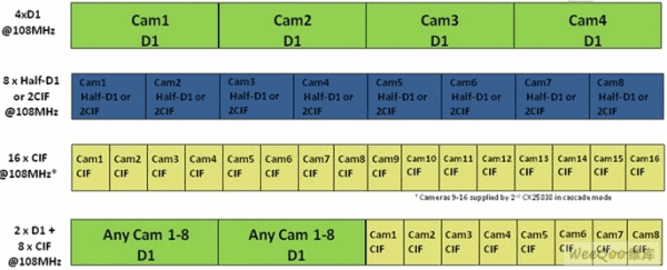 CX25838為監(jiān)控DVR設(shè)計(jì)人員提供機(jī)會,通過提供幀交錯數(shù)據(jù)實(shí)現(xiàn)編解碼器效率最大化,而不采用昂貴的FPGA或可編程邏輯。它還通過提供各種分辨率和幀速率,在一系列產(chǎn)品*享系統(tǒng)架構(gòu),提供規(guī)模優(yōu)勢的能力。例如,低成本DVR可采用一個(gè)編解碼器以全幀速率壓縮16個(gè)CIF分辨率通道,這可通過一條8位總線實(shí)現(xiàn)。其他解決方案可能需要每個(gè)編解碼器以全幀速率壓縮4個(gè)D1分辨率通道。還有些可能需要降低幀速率的D1