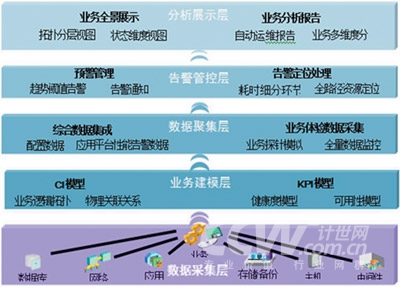 業(yè)務(wù)建模層: 是整個(gè)監(jiān)控系統(tǒng)的核心,是將業(yè)務(wù)進(jìn)行有形化管理、量化衡量的高效手段。該業(yè)務(wù)建模層中涵蓋了幾乎所有的BOSS管理資源要素,包括業(yè)務(wù)、應(yīng)用、服務(wù)及其他平臺(tái)類資源,這些信息都建立并實(shí)時(shí)更新于企業(yè)集中建設(shè)的符合ITIL標(biāo)準(zhǔn)的CMDB(配置資源數(shù)據(jù)庫,其中每一子項(xiàng)便是一個(gè)CI配置資源項(xiàng))中;贑MDB中動(dòng)態(tài)調(diào)整的實(shí)時(shí)CI項(xiàng)和相互關(guān)系,關(guān)聯(lián)上能夠反映業(yè)務(wù)當(dāng)前狀況的KPI指標(biāo),以結(jié)構(gòu)化的模型框架為指導(dǎo),建立完整的業(yè)務(wù)CI/KPI指標(biāo)體系,繪制出以業(yè)務(wù)為中心的BOSS系統(tǒng)視圖,全面展現(xiàn)其健康度和可用性。