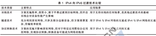 目前,主要的過(guò)渡技術(shù)有雙棧技術(shù)、隧道技術(shù)和協(xié)議轉(zhuǎn)換技術(shù)等。雙棧技術(shù)就是在設(shè)備上同時(shí)安裝IPv4和IPv6協(xié)議棧,應(yīng)用程序根據(jù)DNS解析地址類(lèi)型選擇使用IPv6或IPv4;隧道技術(shù)有多種實(shí)現(xiàn)方式,主要將IPv6報(bào)文作為IPv4的凈荷,實(shí)現(xiàn)IPv6孤島之間的互聯(lián),或者以相反方式實(shí)現(xiàn)IPv4孤島之間的互聯(lián);協(xié)議轉(zhuǎn)換技術(shù)通常應(yīng)用在IPv6和IPv4網(wǎng)絡(luò)的交界處,實(shí)現(xiàn)IPv6主機(jī)與IPv4主機(jī)之間的互通。