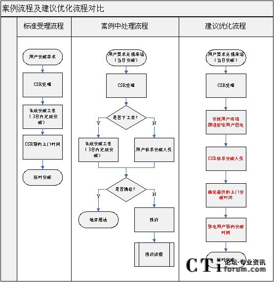 再來看一下“輸出”這個因素。根據(jù)該客服中心的流程,輸出結(jié)果有兩種:一種是由CSR下工單,然后三天內(nèi)安排安裝;一種是用戶自行聯(lián)系安裝人員。但無論是哪種輸出結(jié)果,都不能夠獲得用戶的滿意。第一種超出了用戶能夠接受的服務(wù)時效,第二種將本不該用戶完成的“工作”轉(zhuǎn)移給了用戶。