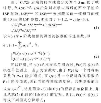G.729的編碼過程如下:輸入8 kHz采樣的數(shù)字語音信號(hào)先經(jīng)過高通濾波預(yù)處理,每10 ms幀作一次線性預(yù)測(cè)分析,計(jì)算10階線性預(yù)測(cè)濾波器系數(shù),然后把這些系數(shù)轉(zhuǎn)換為線譜對(duì)(LSP)參數(shù),采用兩級(jí)矢量量化技術(shù)進(jìn)行量化。自適應(yīng)碼本搜索時(shí),以原始語音與合成語音的誤差知覺加權(quán)最小為測(cè)度進(jìn)行搜索。固定碼本采用代數(shù)碼本機(jī)構(gòu)。激勵(lì)參數(shù)(自適應(yīng)碼本和固定碼本參數(shù))每個(gè)子幀(5 ms,40個(gè)樣點(diǎn))確定一次。