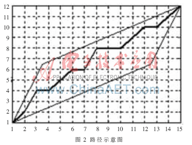把測(cè)試模版的各個(gè)幀號(hào)n=1,…,N在一個(gè)二維直角坐標(biāo)系的橫軸上標(biāo)出,把參考模版的各幀號(hào)m=1,…,M在縱軸上標(biāo)出,通過這些表示幀號(hào)的整數(shù)坐標(biāo)畫出的橫縱線即可形成一個(gè)網(wǎng)格,網(wǎng)格中的每一個(gè)交叉點(diǎn)(n,m)表示測(cè)試模版中某一幀與訓(xùn)練模版中某一幀的交叉點(diǎn)。動(dòng)態(tài)規(guī)劃算法可以歸結(jié)為尋找一條通過此網(wǎng)格中若干格點(diǎn)的路徑,路徑通過的格點(diǎn)即為測(cè)試和參考模版中距離計(jì)算的幀號(hào)。