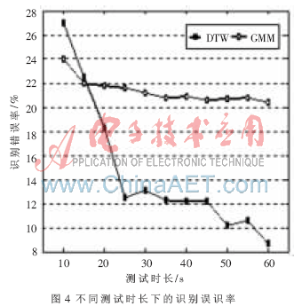 圖4給出基于DTW識(shí)別方法與GMM模型(混元數(shù)64)識(shí)別G.729編碼方案863語料庫的文本相關(guān)說話人的誤識(shí)率對(duì)比圖。橫坐標(biāo)代表的測(cè)試語音的時(shí)長,縱坐標(biāo)代表識(shí)別誤識(shí)率。由實(shí)驗(yàn)結(jié)果可知在文本相關(guān)的說話人識(shí)別中,基于DTW算法的識(shí)別率在絕大多數(shù)情況下高于GMM模型,且隨著測(cè)試語音的增長,優(yōu)勢(shì)更明顯。