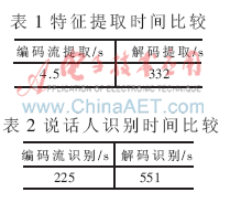 時(shí)間都遠(yuǎn)小于解碼重建后的語音特征提取時(shí)間和識(shí)別時(shí)間,滿足實(shí)時(shí)說話人識(shí)別的需要。