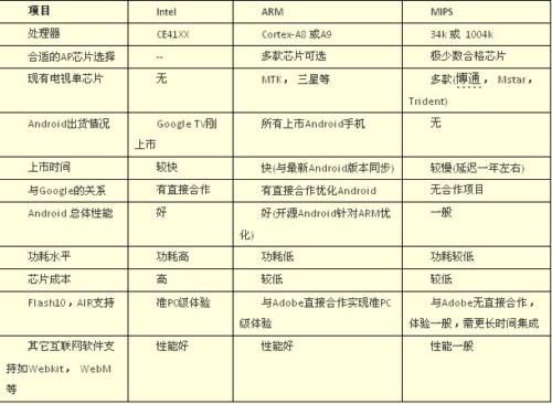 這三種處理器架構(gòu)各有優(yōu)缺點(diǎn),都希望成為未來Android互聯(lián)網(wǎng)電視(如果成功的話)的最主流平臺。那么哪一個處理器將最終勝出呢,答案只有留給時間來揭曉,我們不妨先來對這三個架構(gòu)進(jìn)行一番比較: