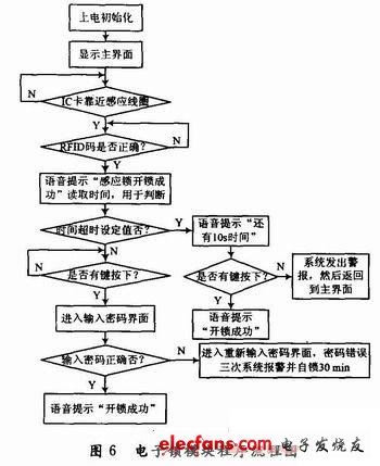如圖2所示,電子鎖原始密碼和用戶設(shè)定密碼已存于外部存儲(chǔ)器E2PROM內(nèi),用戶要開(kāi)門需先用電子感應(yīng)鑰匙開(kāi)RFID碼感應(yīng)鎖,當(dāng)感應(yīng)鎖成功開(kāi)鎖時(shí),系統(tǒng)將發(fā)出語(yǔ)音提示“感應(yīng)鎖開(kāi)鎖成功”,然后輸入先前設(shè)定的密碼,密碼正確后,系統(tǒng)發(fā)出語(yǔ)音提示“開(kāi)鎖成功”,否則提示“輸入密碼錯(cuò)誤”。輸入密碼三次以上錯(cuò)誤,系統(tǒng)將報(bào)警并自鎖30 min。整個(gè)開(kāi)鎖時(shí)間不能超過(guò)30 s,否則系統(tǒng)發(fā)出警報(bào)聲,以防止盜賊在短時(shí)間內(nèi)利用萬(wàn)能工具開(kāi)鎖。系統(tǒng)待機(jī)時(shí)能在液晶上顯示時(shí)間、日期和星期等信息,實(shí)現(xiàn)友好的人機(jī)界面。