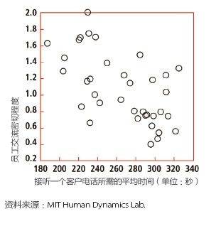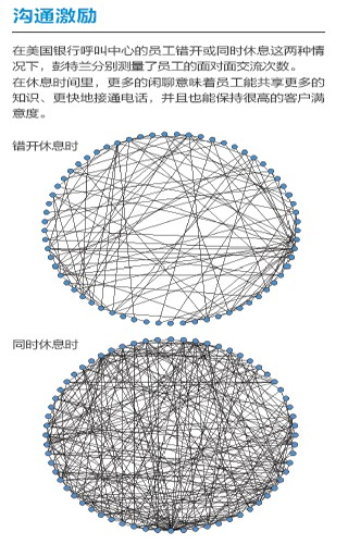 去年,彭特蘭的實(shí)驗(yàn)室與美國(guó)銀行(Bank of America)設(shè)在羅得島(Rhode Island)的呼叫中心合作,在80 名中心員工身上安裝了社會(huì)傳感器。這種傳感器看起來(lái)像一枚不顯眼的徽章,使用藍(lán)牙和紅外信號(hào)監(jiān)測(cè)實(shí)驗(yàn)對(duì)象每分鐘與哪些同事交談。測(cè)試活動(dòng)先開(kāi)展了一個(gè)月,后來(lái)又進(jìn)行了6周。第一個(gè)月后,實(shí)驗(yàn)室的研究人員發(fā)現(xiàn),與更多同事進(jìn)行過(guò)交談的員工能夠更快地接通電話(huà),他們自我感覺(jué)的壓力也相對(duì)較小,而客戶(hù)滿(mǎn)意度卻與其他人一樣高。與刻板地遵循員工手冊(cè)或服從經(jīng)理的電子郵件指示相比,通過(guò)非正式的閑聊來(lái)交流問(wèn)題和解決方案似乎能取得更好的結(jié)果。有了這種結(jié)論之后,該呼叫中心嘗試盡量將員工的休息時(shí)間安排在一起,而非像過(guò)去那樣錯(cuò)開(kāi)。這樣員工就有了更多的時(shí)間參與閑聊。幾個(gè)月后,美國(guó)銀行向?qū)嶒?yàn)室報(bào)告了結(jié)果:該呼叫中心獲得了相當(dāng)于每年1,500 萬(wàn)美元的生產(chǎn)力提升。