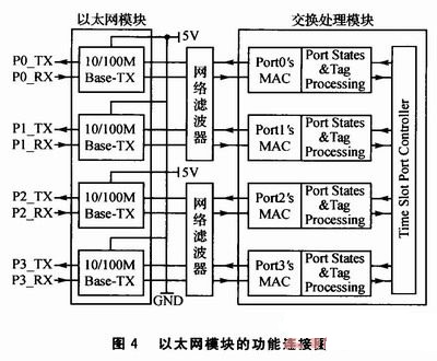 以太網(wǎng)模塊的功能連接圖如圖4所示,進(jìn)出以太網(wǎng)接口的信號(hào)都需要經(jīng)過網(wǎng)絡(luò)濾波器,網(wǎng)絡(luò)濾波器實(shí)質(zhì)上是一個(gè)選頻電路,它的功能就是允許某一部分頻率的信號(hào)順利的通過,而另外一部分頻率的信號(hào)則受到較大的抑制。與網(wǎng)絡(luò)濾波器相連的是交換處理模塊中的Port's MAC(M-edia Access Controllers),用來解決在共用信道中產(chǎn)生競爭時(shí)分配信道的使用權(quán)問題。