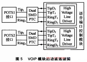 VOIP模塊的功能連接圖如圖5所示。Dual SMD PTC叫做雙重?zé)崦綦娮瑁蓪?duì)過熱和過流雙重作用導(dǎo)致的電路故障進(jìn)行保護(hù);Tip and Ring(正極線和負(fù)極線)表示組成電話配線電路的兩條電線,Tip是正極線的別稱,Ring是負(fù)極電線的別稱。