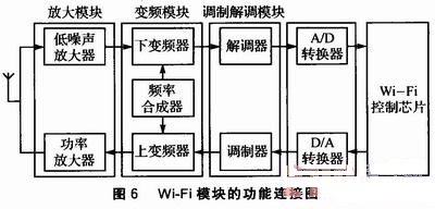 Wi—Fi模塊的功能連接圖如圖6所示。本系統(tǒng)的天線是外置天線,這樣能盡量穩(wěn)定信號(hào)。天線與RF射頻模塊相連,RF射頻模塊大致可分為放大模塊、變頻模塊、調(diào)制解調(diào)模塊等有源部件,然后通過A/D、D/A轉(zhuǎn)換與Wi—Fi控制芯片相連。Wi—Fi控制芯片控制整個(gè)無線模塊的運(yùn)行。