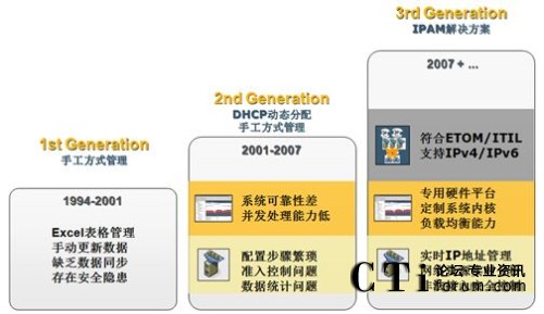 新一代網絡核心服務自動化管理支撐平臺能自動、有效地管理訪問網絡的IP/MAC 資源,實時提供更新數據,控制未授權IP/MAC地址訪問網絡,從而提高內部網絡的可管理性和安全性。下圖是網絡核心服務解決方案的所經歷的發(fā)展階段: