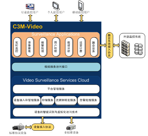 高新興通信最新推出基于云計(jì)算的C3M-Video視頻監(jiān)控管理平臺(tái),具有視頻監(jiān)控管理平臺(tái)的通用功能和業(yè)務(wù)流程,能支持國內(nèi)外主流的視頻設(shè)備。此外,能與高新興現(xiàn)有的動(dòng)力環(huán)境監(jiān)控系統(tǒng)進(jìn)行深度的融合,并以此為基礎(chǔ)逐步演繹成一個(gè)支撐物聯(lián)網(wǎng)應(yīng)用的融合監(jiān)控平臺(tái)。