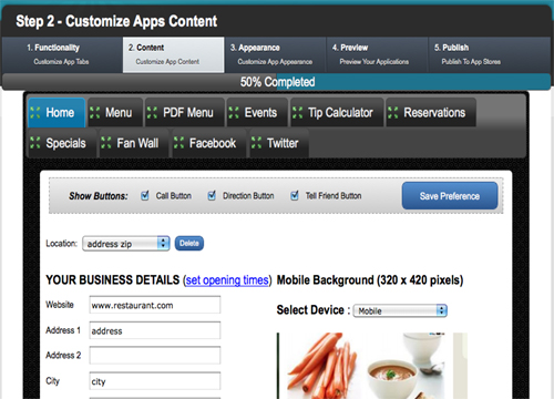 Bizness Apps采用可視化操作界面,用戶(hù)只需要點(diǎn)擊設(shè)置相關(guān)選項(xiàng)就能完成應(yīng)用的開(kāi)發(fā)工作。因此,Bizness Apps很適合缺少專(zhuān)業(yè)技術(shù)人員的小企業(yè)開(kāi)發(fā)本行業(yè)應(yīng)用。利用Bizness Apps開(kāi)發(fā)行業(yè)應(yīng)用只需五步。首先,開(kāi)發(fā)者選擇對(duì)應(yīng)的行業(yè)后,需要為應(yīng)用添加功能組件。第二步,為訂制好的功能組件添加內(nèi)容。第三步,為應(yīng)用選定外觀的設(shè)計(jì)方案。第四步,預(yù)覽經(jīng)過(guò)定制后的應(yīng)用。最后,完成付費(fèi)后即可發(fā)布你的應(yīng)用。