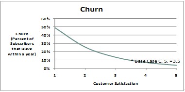 部署智能管道可以在網(wǎng)絡容量和業(yè)務保障方面產(chǎn)生積極影響。針對高端用戶提供免溢價的高價值服務/業(yè)務,會提高高端用戶群體的滿意度。高端用戶是高額利潤的保障,是所有運營商爭取的目標,而用戶滿意度是決定他們是否留在網(wǎng)絡的最重要因素。應用智能管道后,預期年離網(wǎng)率將下降1%~2%。離網(wǎng)率的降低,將使用戶平均停留在本網(wǎng)絡的周期加長,從而增加收入并減少新用戶的獲取成本。這一部分的價值和意義,將大于資源合理分配和差異化業(yè)務的價值。下面的圖表顯示了離網(wǎng)率和用戶滿意度的關(guān)系。