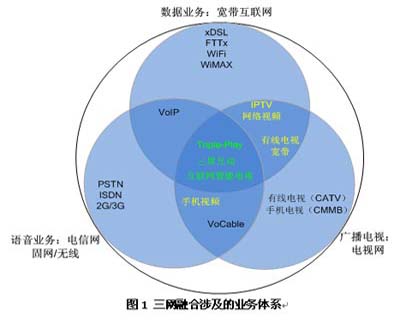 這種沖擊表現(xiàn)在信息通信領(lǐng)域的“時(shí)移事易”上,一個(gè)是在時(shí)間維度上,一個(gè)是在影響產(chǎn)業(yè)發(fā)展重大事件的維度上。其長(zhǎng)期累積的結(jié)果是,當(dāng)前全球范圍內(nèi)影響最大、最深遠(yuǎn)的莫過于寬帶網(wǎng)絡(luò)成為國家的信息化基礎(chǔ)設(shè)施。寬帶的普及深刻的影響和推動(dòng)了以TCP/IP為技術(shù)基礎(chǔ)的“三重播放”和在市場(chǎng)競(jìng)爭(zhēng)層面的“多重捆綁”業(yè)務(wù)營銷策略,這構(gòu)成了三網(wǎng)融合最基本的內(nèi)容,隨之帶動(dòng)了近年已成為業(yè)界關(guān)注焦點(diǎn)的視頻業(yè)務(wù)向“一云三網(wǎng)多屏”的方向發(fā)展。總之,新技術(shù)和新產(chǎn)業(yè)發(fā)展導(dǎo)致傳統(tǒng)的電信業(yè)和廣播電視業(yè)從封閉逐步走向開放,渠道、內(nèi)容、消費(fèi)者偏好均從單一走向多元;對(duì)消費(fèi)者而言,信息的流動(dòng)從單向變?yōu)殡p向和多向,新媒體、全媒體、自媒體在社會(huì)上的份量快速上升。 而來自市場(chǎng)的需求變化是:過去那種內(nèi)容和服務(wù)緊密捆綁于網(wǎng)絡(luò)的業(yè)務(wù)模式被開放的互聯(lián)網(wǎng)沖擊得疲于招架,網(wǎng)絡(luò)和渠道的地位不斷下降,處于底層的網(wǎng)絡(luò)整合開始朝著契合于上層內(nèi)容和應(yīng)用整合的方向發(fā)展;內(nèi)容和應(yīng)用成為產(chǎn)業(yè)發(fā)展的新重心,傳統(tǒng)運(yùn)營商在挖潛增效做好“智能管道”的同時(shí),也希望借助三網(wǎng)融合躋身綜合信息服務(wù)領(lǐng)域。表現(xiàn)在網(wǎng)絡(luò)層面,傳統(tǒng)的電信業(yè)務(wù)大范圍地向?qū)拵P網(wǎng)上遷移;傳統(tǒng)的有線電視網(wǎng)進(jìn)軍新媒體,“電信化”色彩越來越強(qiáng)。在業(yè)務(wù)層面,如下圖示所,典型的融合業(yè)務(wù)如有線寬帶、IPTV、VoIP、手機(jī)視頻、互聯(lián)網(wǎng)智能電視等成為雙方競(jìng)爭(zhēng)的主陣地。