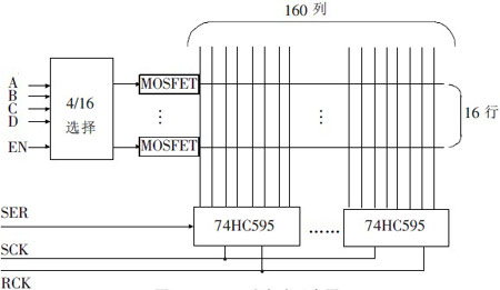 本系統(tǒng)采用行掃描方式,行選通電路由集成電路74HC154構(gòu)成。74HC154是4線-16線高性能譯碼器,在點陣屏幕不大的情況下,一般的單片機可以直接驅(qū)動點陣LED的亮滅,但是考慮擴展為大屏幕尺寸時,因單片機的I/O口不足以提供足夠的驅(qū)動電流,但可在74HC154和點陣的行接口接上一個PNP型8550三極管開關(guān)電路用來提供足夠的電流,當74HC154發(fā)出低電平時,三極管Q導通,輸出高電平。此外,可用帶有2級鎖存移位輸出功能的74HC595鎖存器來對列線進行驅(qū)動控制。LED點陣的列線接到74HC595的8bit并行輸出口上,由單片機控制數(shù)據(jù)的輸出,利用74HC595的鎖存輸出功能,電路共用同一個移位時鐘SCK和數(shù)據(jù)鎖存時鐘RCK,可級聯(lián)多片74HC595以構(gòu)成更大LED點陣屏的列驅(qū)動電路。此結(jié)構(gòu)還可在75HC595的使能端通過PWM波進行灰度調(diào)節(jié)。以一個16行×160列的LED點陣單元為例,本系統(tǒng)采用的驅(qū)動電路原理如圖所示。