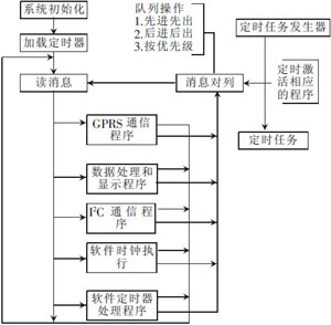 該下位機軟件設(shè)計包括主程序、顯示子程序和通信服務程序的設(shè)計。主程序主要完成中斷的初始化和串口的初始化設(shè)置。顯示程序主要完成數(shù)據(jù)的各種顯示,顯示部分采用動態(tài)掃描的方式,實現(xiàn)對顯示屏要顯示的漢字、圖像、字符等數(shù)據(jù)信息進行傳輸控制以及顯示等功能。通信服務程序主要完成GPRS的數(shù)據(jù)接收、數(shù)據(jù)的分割處理、數(shù)據(jù)的發(fā)送等任務。本文采用模塊化程序設(shè)計,程序各部分的功能由各個模塊分別實現(xiàn)。程序模塊有:系統(tǒng)初始化模塊、GPRS通信模塊、數(shù)據(jù)的處理和存儲模塊、I2C通信模塊。為了保證系統(tǒng)工作的實時性和高效性,本系統(tǒng)采用了實用單片機系統(tǒng)MS3,MS3是一套針對MCU51的開發(fā)平臺,借簽了VC編程的消息機制,把各個功能有效地組織起來。RTOS的系統(tǒng)時鐘,實現(xiàn)高效的按鍵掃描和快速的響應中斷,執(zhí)行例行程序。顯示終端主程序如圖所示。