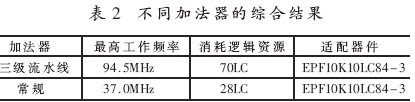 (2)針對(duì)不同運(yùn)算的位寬需要,設(shè)計(jì)專用的加法器和乘法器。本文對(duì)整數(shù)變換中的加法器采用三級(jí)流水線加法器,實(shí)現(xiàn)9位加法,每級(jí)流水線完成三位超前進(jìn)位加法,將邏輯延遲限制在三位加法器之內(nèi)。圖2給出了9位加法器的流水線實(shí)現(xiàn)框圖。選用EPF10K10LC84-3作為適配器件,經(jīng)過(guò)Synplify Pro 7.3綜合,結(jié)果表明這種加法器具有較優(yōu)的最高工作頻率和硬件開(kāi)銷。如表2所示, 常規(guī)加法器的最高工作頻率為37.0MHz,消耗資源卻為28LC,而經(jīng)過(guò)優(yōu)化的三級(jí)流水線加法器在消耗資源增加不多的情況下,其最高工作頻率相比常規(guī)加法器提高了257%,達(dá)到94.5MHz。