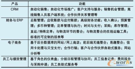 NetSuite國際版是行業(yè)領(lǐng)域首個(gè)也是目前唯一一款能夠支持整個(gè)公司業(yè)務(wù)流程的在線商業(yè)軟件。此產(chǎn)品可以給客戶從客戶關(guān)系管理(CRM)到企業(yè)資源規(guī)劃(ERP)再到網(wǎng)站功能的全面支持(見表1)。