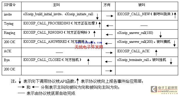 oSIP/eXosip對(duì)消息的報(bào)告有2種工作模式:事件模式和回調(diào)模式。本設(shè)計(jì)采用事件模式, 通過(guò)函數(shù)eXosip_event_wait定時(shí)輪詢獲取SIP事件。SIP信令的實(shí)現(xiàn)如表2