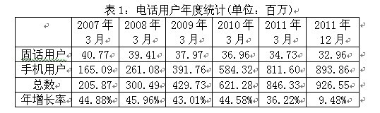 政府對電信市場的開放不僅帶來了電信產(chǎn)業(yè)的快速發(fā)展,激烈的競爭也令消費者享受到性價比更高的服務(wù)。近幾年,電話用戶總數(shù)持續(xù)增長,從1999年的2281萬增加到2011年3月底的8億4633萬。截至2011年12月31日,電話用戶總數(shù)達(dá)到9億2655萬,說明從2011年4-12月期間新增用戶8022萬。其中,手機(jī)用戶數(shù)增長最為顯著,從2007年的1億6509萬增加到2011年3月的8億1160萬,2011年12月底達(dá)到8億9386萬。但是,固話用戶的數(shù)量則從2007年的4077萬減少到2011年3月的3473萬,到2011年12月僅有3269萬。(見表1)