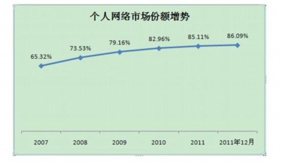 手機(jī)的增長非常顯著,從2007年開始,手機(jī)用戶每年以42.7%的速度增長。手機(jī)的市場份額從2007年的80.19%增加到2011年12月的96.47%,現(xiàn)在已經(jīng)遠(yuǎn)遠(yuǎn)超過了固話。