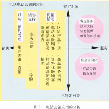 ——圖2表示以電話營(yíng)銷的目的及對(duì)象為軸分析電話營(yíng)銷的應(yīng)用?v軸為對(duì)象,分為“特定”和“不特定”,橫軸為目的,分為“服務(wù)”和“銷售”。這樣右上區(qū)域=“特定對(duì)象X服務(wù)”,即為客戶服務(wù),右下區(qū)域=“不特定對(duì)象X服務(wù)”,對(duì)應(yīng)信息咨詢;左側(cè)為銷售。從對(duì)象來(lái)看,服務(wù)更偏重于“特定對(duì)象”。從目的來(lái)看,訂購(gòu)/預(yù)約受理是最直接的銷售行為,所以放在最左,銷售支持在中間,促銷活動(dòng)靠右。