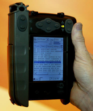 這款Marine Acoustics于2003年4月22日在舊金山的嵌入式系統(tǒng)會(huì)議(Embedded Systems Conference)上展示的新型語言翻譯機(jī),采用微軟CE系統(tǒng),可讓使用者對著機(jī)器說話,再將整句話翻成別國語言發(fā)聲,可做為隨身攜帶的移動(dòng)翻譯機(jī)。目前美國軍方已采用數(shù)百部,配備給派駐在阿富汗以及伊拉克的美軍使用。