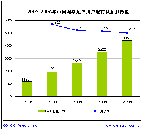 根據(jù)iResearch調查2002年網(wǎng)絡短信用戶為1182萬,占網(wǎng)民總數(shù)的20%,2003年達到1925萬,增長率為62.9%,預計到2006年將達4400萬,有30%的網(wǎng)民會使用網(wǎng)絡短信,網(wǎng)絡短信市場將具有非常廣泛的用戶基礎。