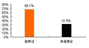 調(diào)查數(shù)據(jù)顯示,在所訪問6個城市的手機用戶中,已使用過數(shù)據(jù)增值業(yè)務(wù)(包括已使用過短信業(yè)務(wù)或已使用過其它業(yè)務(wù)的)的用戶占總體的68.1%,而還未使用過數(shù)據(jù)增值業(yè)務(wù)的占總體的31.9%。如下圖所示: