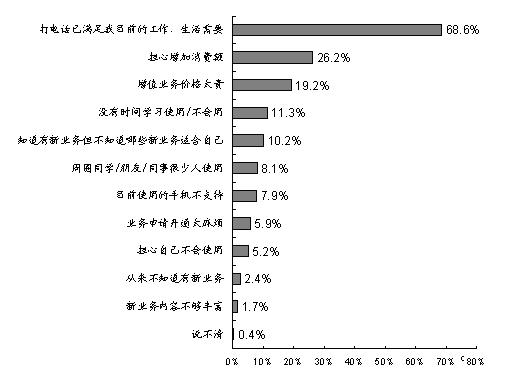 調(diào)查發(fā)現(xiàn),目前制約手機用戶使用更多數(shù)據(jù)增值業(yè)務(wù)的原因主要是:“打電話已經(jīng)滿足目前的工作/生活需要”(占68.6%)、“擔(dān)心增加消費額”(占26.2%)、“增值業(yè)務(wù)價格太貴” (占19.2%)、“沒有時間學(xué)習(xí)使用/不會用”(占11.3%)、“知道有新業(yè)務(wù)但不知道哪些新業(yè)務(wù)適合自己”(占10.2%)等。