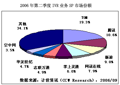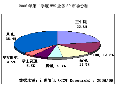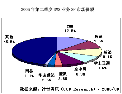 計世資訊(CCW Research)調研顯示。2006年第二季度,中國SMS業(yè)務市場規(guī)模達到118.3億元人民幣,其中SP收入12.1億元人民幣。TOM、騰訊和新浪排名前三位,分別占12.5%、9.6%和9.1%。其次為掌上靈通和空中網,占8.6%和8.3%。