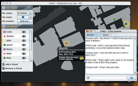 該軟件名為iFind,乍一看類似任何典型的即時(shí)通信軟件,也需要雙方相互邀請(qǐng),這樣才能進(jìn)入對(duì)方的好友名單。用戶可以選擇暫時(shí)隱藏起來,不讓某個(gè)好友或者整個(gè)群組看見自己,他們還可以完全把某人從好友名單中刪除。不過iFind的好友名單增加了地圖,可以實(shí)時(shí)顯示這些朋友在MIT校園的哪個(gè)角落。地圖顯示了通過Wi-Fi登錄到MIT網(wǎng)絡(luò)上的好友,讓用戶可以為每個(gè)朋友創(chuàng)建獨(dú)特的迷你頭像,能看到誰在學(xué)校河邊閑逛、誰在樓上圖書館看書。