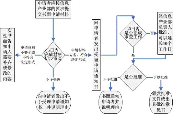 信息產(chǎn)業(yè)部或者省、自治區(qū)、直轄市通信管理局應(yīng)當(dāng)自發(fā)出受理申請(qǐng)通知書之日起20個(gè)工作日內(nèi)完成審查工作,作出批準(zhǔn)或不予批準(zhǔn)的決定。20個(gè)工作日內(nèi)不能做出決定的,經(jīng)信息產(chǎn)業(yè)部或者省、自治區(qū)、直轄市通信管理局負(fù)責(zé)人批準(zhǔn),可以延長10個(gè)工作日,并將延長期限的理由告知申請(qǐng)人。予以批準(zhǔn)的,出具正式批準(zhǔn)文件;不予批準(zhǔn)的,書面通知申請(qǐng)人并說明理由。