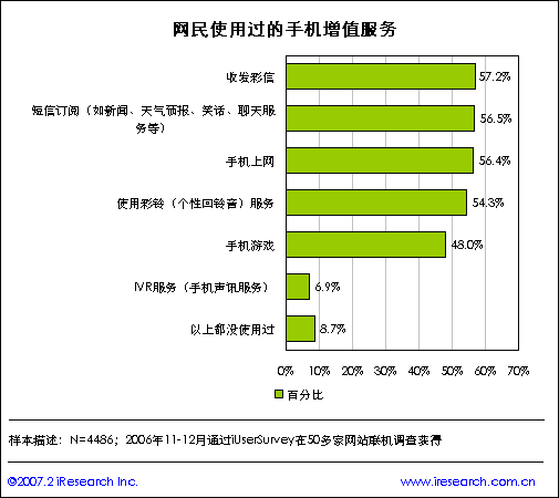 中國(guó)移動(dòng)的增值業(yè)務(wù)已經(jīng)發(fā)展到一個(gè)相對(duì)成熟的階段,增值業(yè)務(wù)對(duì)整體業(yè)務(wù)的貢獻(xiàn)度有望進(jìn)一步提高,2006年中國(guó)移動(dòng)增值收入比例達(dá)到23.5%。中國(guó)移動(dòng)的增值業(yè)務(wù)收入構(gòu)成目前還比較單一,短信占主導(dǎo)。WAP/MMS/Java等2.5G業(yè)務(wù)將從2007年開(kāi)始進(jìn)入高速發(fā)展階段,而CRBT和IVR則將逐漸進(jìn)入成熟期與調(diào)整期,增長(zhǎng)速度趨緩。iResearch艾瑞市場(chǎng)咨詢通過(guò)對(duì)用戶研究發(fā)現(xiàn),彩信、短信、WAP、彩鈴及手機(jī)游戲最受用戶青睞,彩信、短信訂閱、手機(jī)上網(wǎng)、彩鈴及手機(jī)游戲是用戶使用最多的移動(dòng)增值業(yè)務(wù)。