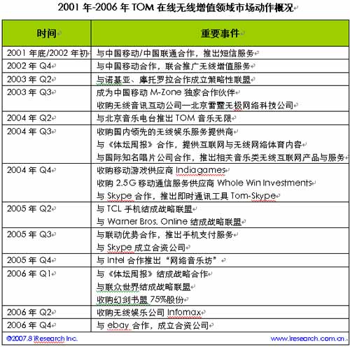 2000年中,TOM在線正式推出,這家一開(kāi)始便以無(wú)線增值為特色的企業(yè)符合了當(dāng)時(shí)中國(guó)互聯(lián)網(wǎng)市場(chǎng)的環(huán)境,那時(shí)無(wú)線增值業(yè)務(wù)如火如荼,第五媒體的概念呼之欲出。隨后,便開(kāi)始了與各大無(wú)線媒體、傳統(tǒng)媒體等一系列的合作和收購(gòu),所涉及的領(lǐng)域涵蓋短信、無(wú)線音樂(lè)、手機(jī)游戲、手機(jī)支付、手機(jī)體育新聞、即時(shí)通訊等許多行業(yè),一個(gè)龐大的無(wú)線媒體帝國(guó)看似已經(jīng)牢不可破。直到,2006年第四季度與ebay易趣合并,開(kāi)始涉足電子商務(wù)。