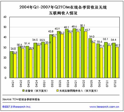 在2006年第二季度總營(yíng)收以及無(wú)線互聯(lián)網(wǎng)服務(wù)收入分別達(dá)到歷史最高點(diǎn)(分別達(dá)到5010萬(wàn)美元和4571萬(wàn)美元)之后,TOM在線各季收入及無(wú)線互聯(lián)網(wǎng)收入呈逐季下滑趨勢(shì),至2007年第二季度,TOM在線的總營(yíng)收為3439萬(wàn)美元,來(lái)自無(wú)線互聯(lián)網(wǎng)服務(wù)的收入為3024萬(wàn)美元。