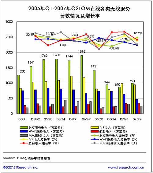 隨后,各無(wú)線服務(wù)收入則基本處于下滑趨勢(shì),在2007年第二季度,除短信服務(wù)收入達(dá)到991萬(wàn)美元,較上一季度增長(zhǎng)13.9%之外,MMS收入僅246萬(wàn)美元,環(huán)比減少23.1%,WAP服務(wù)收入為471萬(wàn)美元,環(huán)比減少27.3%。