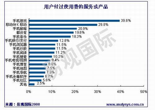據(jù)易觀國(guó)際《中國(guó)手機(jī)應(yīng)用市場(chǎng)用戶調(diào)研報(bào)告2008》研究發(fā)現(xiàn),用戶付過(guò)使用費(fèi)的手機(jī)應(yīng)用服務(wù)及產(chǎn)品中,手機(jī)游戲、移動(dòng)IM和手機(jī)郵箱的比例較高。其中39.6%的手機(jī)應(yīng)用用戶付費(fèi)玩過(guò)手機(jī)游戲,29.8%的用戶曾經(jīng)為移動(dòng)IM付費(fèi),而手機(jī)郵箱的付費(fèi)用戶將達(dá)20%。其他手機(jī)應(yīng)用產(chǎn)品或服務(wù)中,付費(fèi)用戶的比例相當(dāng),均在10%左右,但是有近20%的用戶沒(méi)有用過(guò)任何的付費(fèi)服務(wù)或產(chǎn)品。