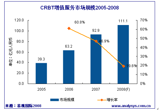 2007年中國CRBT市場規(guī)模達92.9億,保持較為高速的增長勢頭。